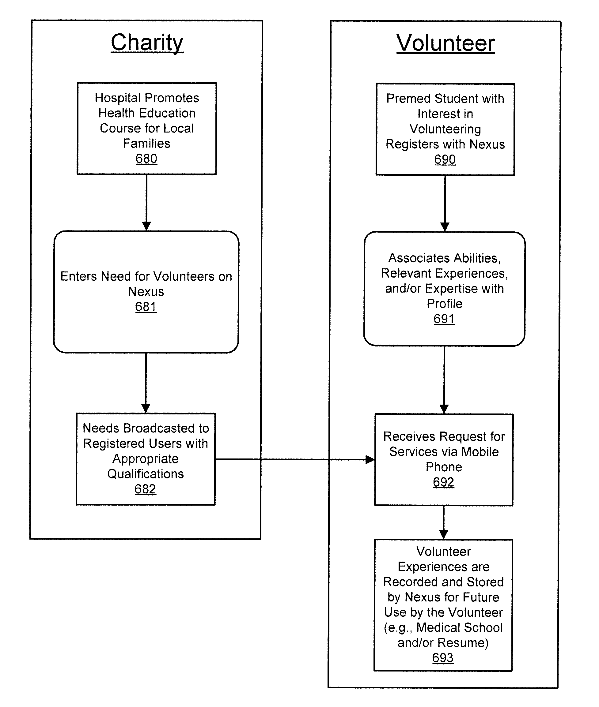 The present disclosure details apparatuses, systems and methods for providing a Volunteer Sponsor Charity Nexus. The Nexus enables volunteers, sponsors and charities to easily identify, connect, and coordinate with one another. The disclosed systems and methods collect profile data for volunteers, …